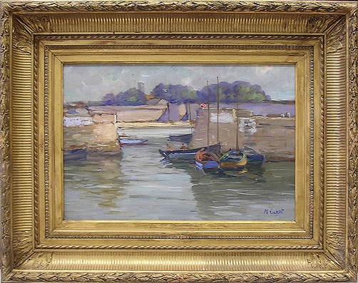 oil on board. Hand signed by the artist "M. Canet" in blue paint, lower right. Dimensions: unframed: 11" x 16", framed: 23 3/4" x 18 3/4" Born in Paris, Canet was a genre and landscape painter who studied under