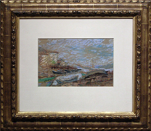 Original pastel. Signed in blue pastel lower left and in pencil in center back. Dimensions: Image size: 6" x 9 3/8"; Framed: 16 3/4" x 19 1/8" No one can remain unmoved by the plein-air pastel works of Auguste Pégurier with their spontaneous, rapid hatching strokes, subtle colors, and their ability to capture the vibrations of intense light and shadow. Although his pastels exude an elegant and subtle sensibility, they also capture the vibrations of the light beautifully. As a son of a ship captain, and born in the maritime village of Saint-Tropez in the South of France, Pégurier is the first painter, before the arrival of Signac, to turn to the village and its quaint and unknown surroundings for inspiration. Pégurier studied in Toulon, Marseille and then at the Académie Julian in Paris where he studied under Carolus Duran and Cormon. It was at that time that he became friends with John Singer Sargent and discovered the works of the impressionists. Even though Pégurier traveled to Holland, the Basque country, Venice and Switzerland, he always seemed to direct the subject of his landscapes back to the Provence region. Starting in 1884 he participated in the Salons des Artistes Français. On the advice of Signac, starting in 1886 he also exposed at the Salons des Indépendants and the Salons d’Automne in Paris. A retrospective of his work was held in the Musée de L’Annonciade in Saint-Tropez in 1981. Several of his pastel works are in the collection of the Musée de L’Annonciade. His work is also at the Musée Chéret in Nice and the Musée d’Orsay in Paris. |