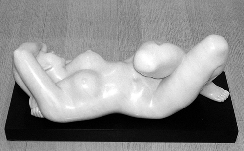 White marble sculpture on a 1 1/2 inch black wood base. Signature and date incised in the stone "Amaya 2002".