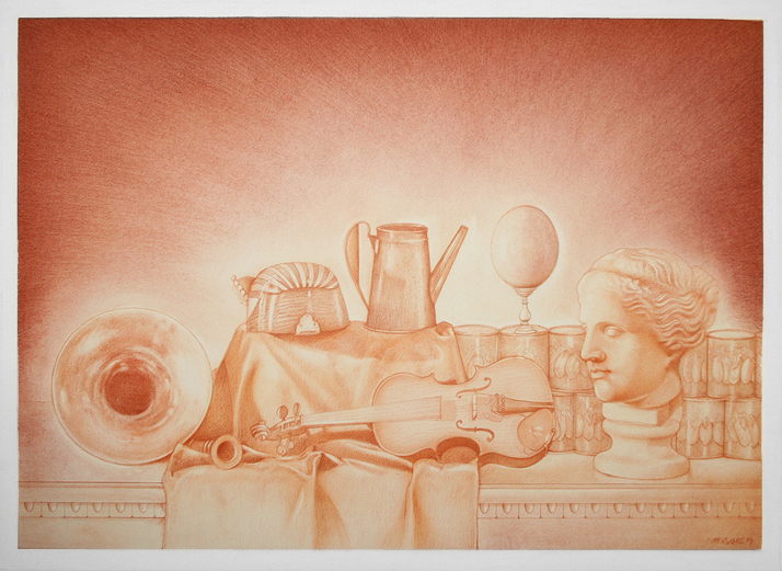 Original drawing in burnt-red conté crayon on 100% Fabriano wove paper with deckled edges. Hand signed and dated in red conté crayon lower right: "P. Carosone 89". In very good condition, unframed. |