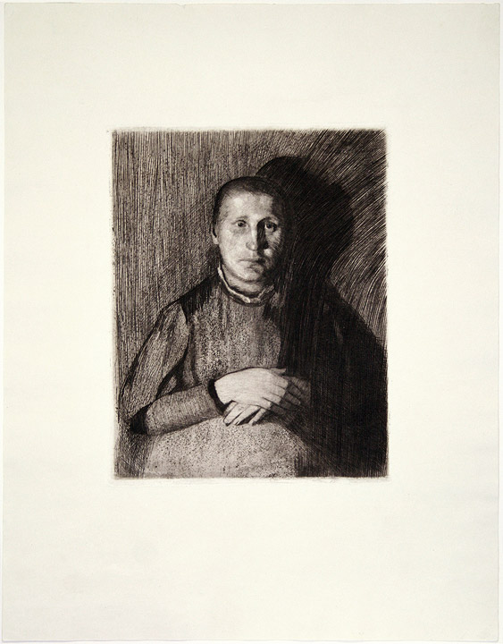 Original etching in brown ink on copperplate paper with faded signature below platemark, lower right. Printed by Felsing. In excellent condition. When asked by a writer why she did not draw “beautiful things” Käthe responded, “For me the proletariat was beautiful. The outward appearance of typical workers stimulated me to portray them. Only later when, through closer contact, I really learned to know the misery and poverty of the workers did there arise [in me] a feeling of obligation - to serve them by means of my art.” (Klein & Klein, p.156) |