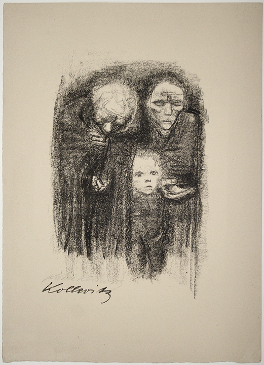 Original lithograph printed with black ink on copperplate paper. Included in the portfolio "Krieg" (War) produced by Internationale Arbeiterhilfe in memory of the ten year anniversary of the beginning of World War I. Signed on the stone, lower left, with the additional hand signature "Käthe Kollwitz" in pencil, lower left. A proof from the 1931 von der Becke edition. In very good condition. Fighting against poverty and malnourishment was a great concern for Kollwitz. In 1924 she made a portfolio of seven graphic works, later to become known as the “Hunger” portfolio, for the International Workers Aid. She often saw the effects of malnourishment in patients who entered her husband’s medical office where they lived in a poor neighborhood of Berlin. After Germany lost the First World War, inflation rates and taxes increased and many working class people could not even afford food. Kollwitz “Hunger” lithographs were used as posters for various fundraising efforts. |