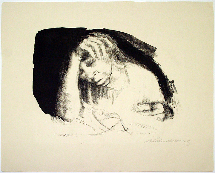 Original crayon and brush lithograph printed on velin paper. Hand signed "Käthe Kollwitz" in pencil, lower right. From the third state of three from stone ‘A’. Proofs such as this one were printed circa 1927 for the members of the Deutsche Kunstgemeinschaft (German Art Association). Stone ‘B’ included text for the poster version. This portrait of an unknown working class woman demonstrates the conflict faced by all working women in the modern era. Kollwitz also struggled between the requirements of her profession and her role as wife and mother. Luckily she could afford a servant who helped her around the house. This domestic help allowed Kollwitz the time to work on her art in the mornings. On one hand, Kollwitz expressed the desire to be free of domestic ties in order to be able to focus more intensely on her art. On the other hand, she also appreciated being needed by her husband and two sons. As a result of this conflict, a working class woman frequently appears as a subject in Kollwitz' art. |