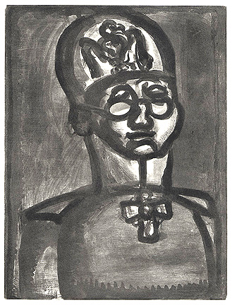 Original aquatint, burnisher, scraper, drypoint and roulette over heliogravure printed in black ink on heavy laid paper with the Ambroise Vollard and Arches watermarks. Signed and dated in the plate: "1922 G.R." at lower left (G.R. printed backwards). An excellent impression of the état définitif from the edition of 450. Plate LI from the Miserere series. Commissioned by Ambroise Vollard; published by the Société de L'Etoile Filante, Paris, 1948; printed by Jacquemin, Paris. The plate has been canceled. |