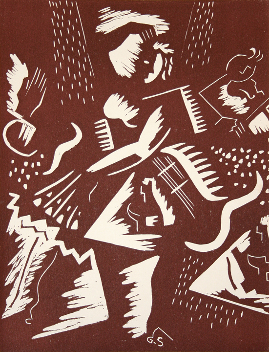 Image size: 12" x 9 1/4", sheet size: 12 1/2" x 9 5/8" Catalogue reference: Meloni 20 Original linocut in brown ink on wove paper. Signed "G.S" in the plate, lower center. From the French edition of six hundred, aside from the English edition of six hundred published in the Art Review "XXe Siècle", Paris, No.5-6, February-March 1939. |