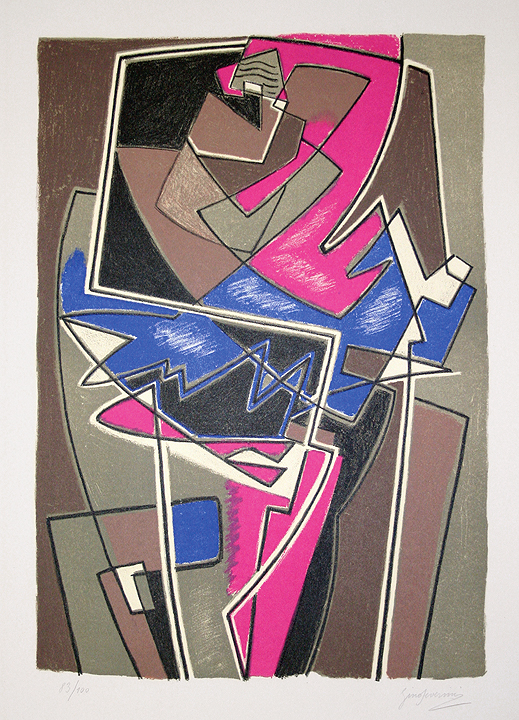 Image size: 14 1/4" x 10", sheet size: 19 3/4" x 15 1/4" Catalogue reference: Meloni 23 Original color lithograph on Arches paper. Hand signed by the artist "Gino Severini" in pencil, lower right, and numbered "83/100" in pencil, lower left. An impression from the signed and numbered edition of 100, aside from a few artist proofs. Published by Associazione Italiana per la Libertà e la Cultura, Rome, 1954. |