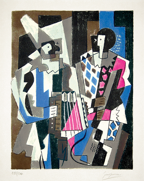 Image size: 14 3/4" x 11 1/4", sheet size: 22 1/8" x 15" Catalogue reference: Meloni 24 Original color lithograph on Pur Fil paper. Hand signed by the artist "Gino Severini" in pencil, lower right, and numbered "198/220" in pencil, lower left. An impression from the signed and numbered edition of 220, aside from a few artist proofs. Published by Guilde de la Gravure, Pully-Losanna, 1954. |