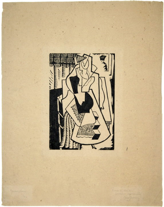 Image size: 7 7/16" x 5 1/16", sheet size: 15 3/4" x 12 1/2" Catalogue reference: Meloni 11 Original linocut on Japon paper. Hand signed by the artist with dedication "À mon très cher ami Guillaume Apollinaire, Gino Severini 1916" in pencil, lower right. Also annotated "Epreuve d'essai" in pencil, lower left. A rare proof, aside from the numbered edition of 15. Originally printed for the Paris magazine "Sic" n.8-10, in the August-October 1916 edition. The print appeared with the erroneous inscription, "Le premier bois de Gino Severini" (The first woodcut by Gino Severini) at the top of the page and "La Modiste", lower center. Provenance: Guillaume Apollinaire; Galerie Kornfeld, Bern; Alice Adam Ltd., Chicago; the Gecht Family Collection, Chicago. Exhibitions: "Gino Severini: From Futurism to Classicism" 1999-2000, Hayward Gallery, London. |