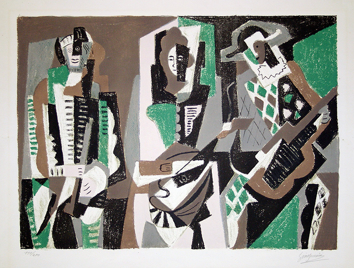 Image size: 13 3/4 x 18 3/4", sheet size: 17 3/4 x 22" Catalogue reference: Meloni 25 Original color lithograph on Rives paper. Hand signed by the artist "Gino Severini" in pencil, lower right, and numbered "110/200" in pencil, lower left. Impression from a signed and numbered edition of 200. Printed by Michael Cassé, Paris. Published by l'Oeuvre Gravée, Paris-Zurich, 1955, with their blindstamp in the lower left margin. |