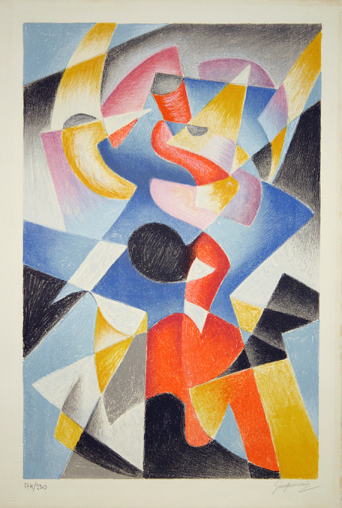Image size: 19 1/4" x 12 1/2", sheet size: 22" x 15" Catalogue reference: Meloni 28 Original lithograph on Rives paper. Hand signed by the artist in pencil, "Gino Severini," lower right and numbered "174/220," lower left. An impression from the signed and numbered edition of 220, aside from the 30 artist proofs numbered in roman numerals. Published by Guilde de la Gravure, Pully-Losanna, 1955 with the publisher's "GG" blindstamp, lower left margin. |