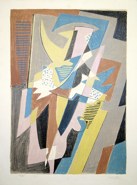 Image size: 23 1/2" x 16 1/2", sheet size: 26" x 20" Catalogue reference: Meloni 32 Original color lithograph on Rives paper. Hand signed by the artist "Gino Severini" in pencil, lower right, and numbered "169/175" in lower left. An impression from the signed and numbered edition of 175. Printed by Michael Cassé, Paris. Published by L'Oeuvre Gravée, Paris-Zurich, 1957 with their blind stamp, lower left margin. |