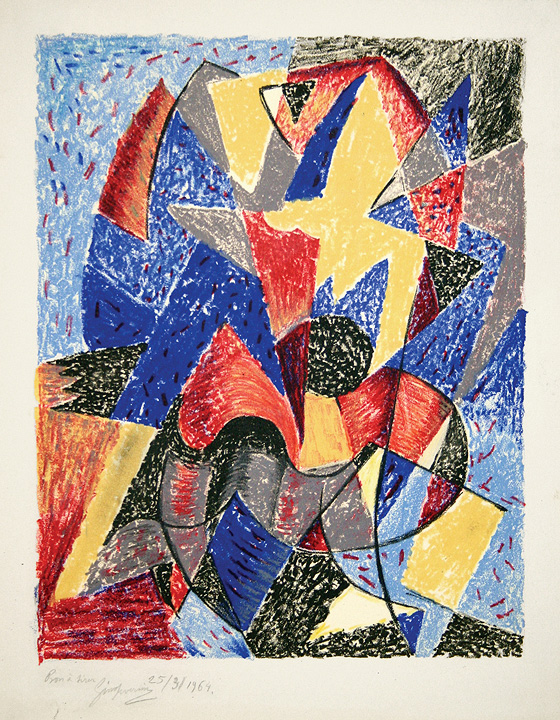 Image size: 11" x 8 5/8". sheet size: 12 7/8" x 10 3/16" Original color lithograph on Rives paper. Hand signed and annotated by the artist in pencil, "Bon à Tirer Gino Severini 25/3/1964" in the lower left margin. Aside from the signed and numbered edition of 75, and a few artist proofs. Printed by Mourlot, Paris. Published by Cerastico, Milan, 1962. This lithograph was commissioned by the publisher Gino Cerastico to accompany a catalogue of the etchings by Umberto Boccioni, which was not published. |
