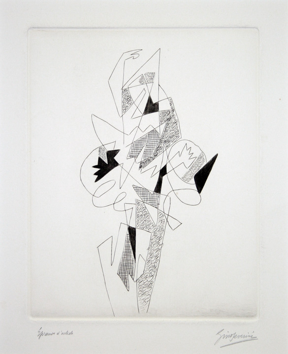 Platemark: 9 3/4" x 7 3/4", sheet size: 25 1/4 x 18" Catalogue reference: Meloni 42 Original etching in black ink on wove paper. Hand signed by the artist "Gino Severini" in pencil, lower right, and annotated "Epreuve d'artiste" in lower left. An artist proof, aside from the signed and numbered edition of 102. Printed by Rodolfo Margheri at Il Bisonte, Florence, 1964, with his blindstamps in the upper and lower right corners. This etching was part of the portfolio entitled "50 incisioni originali di maestri italiani" (50 original etchings by Italian Masters) organized by Galleria Grafica Contemporanea, curated by Carlo L. Ragghianti. The portfolio was a benefit for the National Association for the Assistance of Multiple Sclerosis patients. |