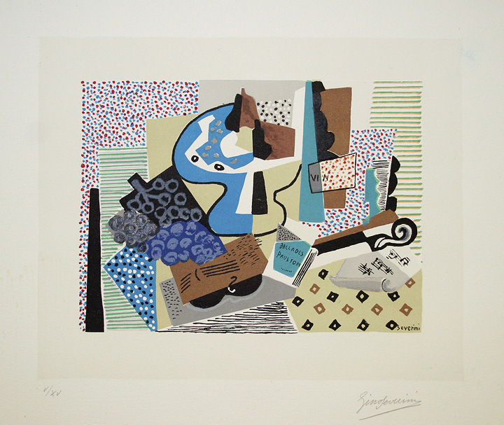 Image size: 8 9/16" x 10 5/8", sheet size: 14 1/2" x 19 1/2" Catalogue reference: Meloni 48 Original color lithograph on wove paper. Hand signed by the artist "Gino Severini" in pencil, lower right, and numbered "V/XV" in pencil, lower left. Also signed "Severini" on the stone, lower right. An impression from the edition of 15 signed and numbered in Roman numerals, aside from the edition 85 signed and numbered in Arabic numerals, and a few artist proofs. Printed by Rodolfo Margheri, Florence. Published by Il Bisonte, Florence, 1965. This lithograph was part of the portfolio "Six lithographs by Severini" with an introduction by Carlo L. Ragghianti and Giovanni Caradente. . |