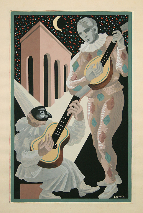 Pochoir in colors on Lafuma paper and laid down on board. Signed in the plate "G. Severini," lower right. An impression of the definitive state from the edition of 125. Published by Etchells & MacDonald, London, 1930. Plate 6 of 16 from the album: Fleurs et Masques.